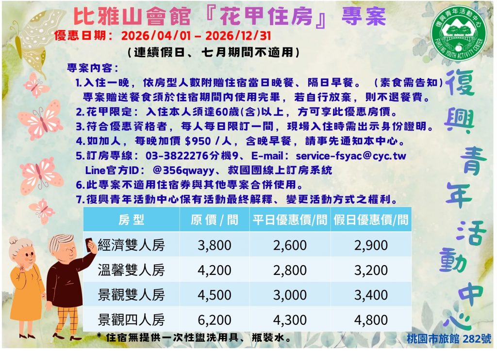 ◎電話開放預訂時間:114年10月1日,每日 09:00~21:00。 ◎救國團官網線上訂房時間:114年10月1日 12:00開放。線上訂房 ◎為實踐ESG環境永續,環保減塑,本中心自113年10月